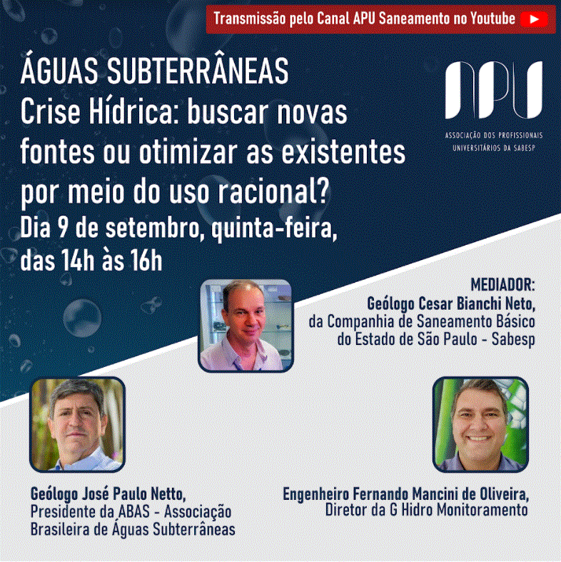 Nesta quinta-feira, 9 de setembro, às 14h, a APU – Associação dos Profissionais Universitários da Sabesp realizará um webinar com o tema “Crise Hídrica: buscar novas fontes ou otimizar as existentes por meio do uso racional?”. O evento será transmitido por meio do canal da Associação no YouTube. Clique aqui para acessar.