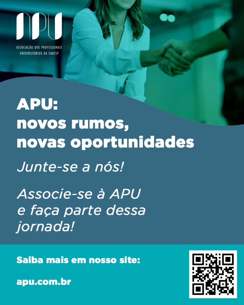 Para que essa nova fase seja um sucesso, a APU conta com o apoio de seus associados e convida todos os funcionários e ex-funcionários da Sabesp a manterem-se ou tornarem-se sócios da entidade. A participação de cada um é fundamental para construirmos um cadastro de profissionais qualificados, capazes de oferecer serviços de excelência ao mercado.