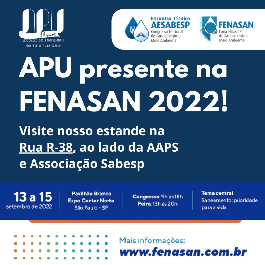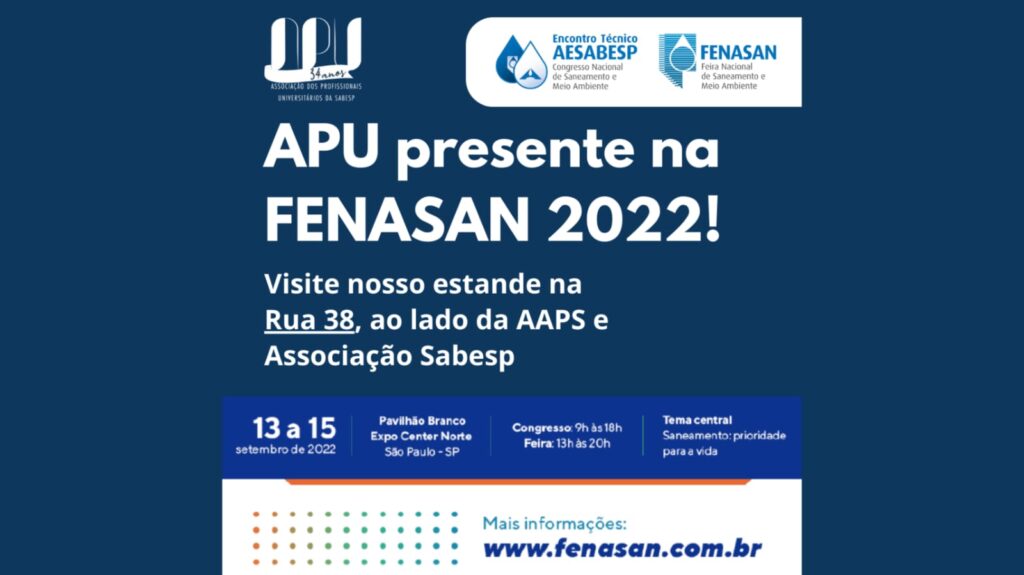 A APU – Associação dos Profissionais Universitários da Sabesp marcará presença no 33º Encontro Técnico da AESabesp – Associação dos Engenheiros da Sabesp/Fenasan 2022, que acontecerá de 13 a 15 de setembro, no Pavilhão Branco do Expo Center Norte/SP.
