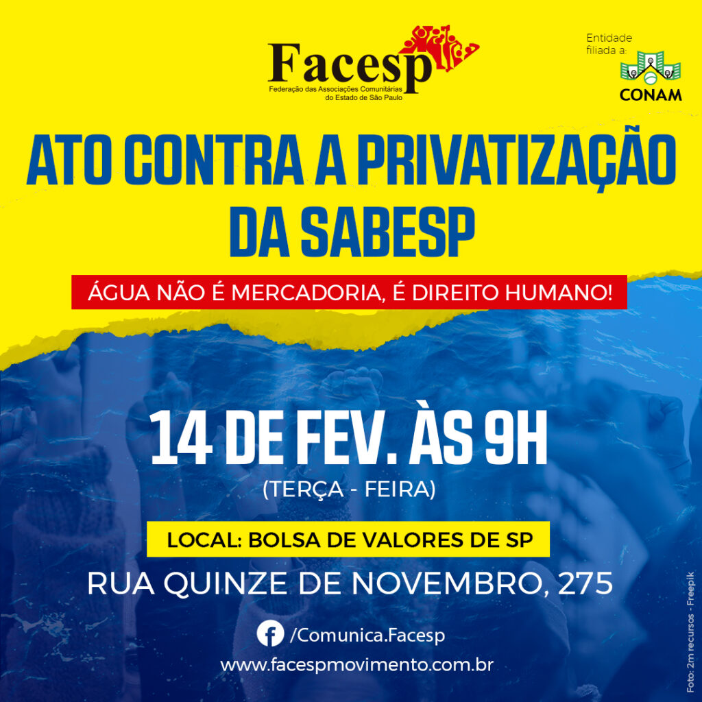 A FACESP – Federação das Associações Comunitárias do Estado de São Paulo apóia incondicionalmente a Luta do Sintaema e dos Urbanitários de todo Brasil, que estão engajados no combate a Privatização da SABESP. O Movimento Comunitário Paulista conhece as experiências fracassadas no Brasil e no mundo, de privatização da água e do saneamento.