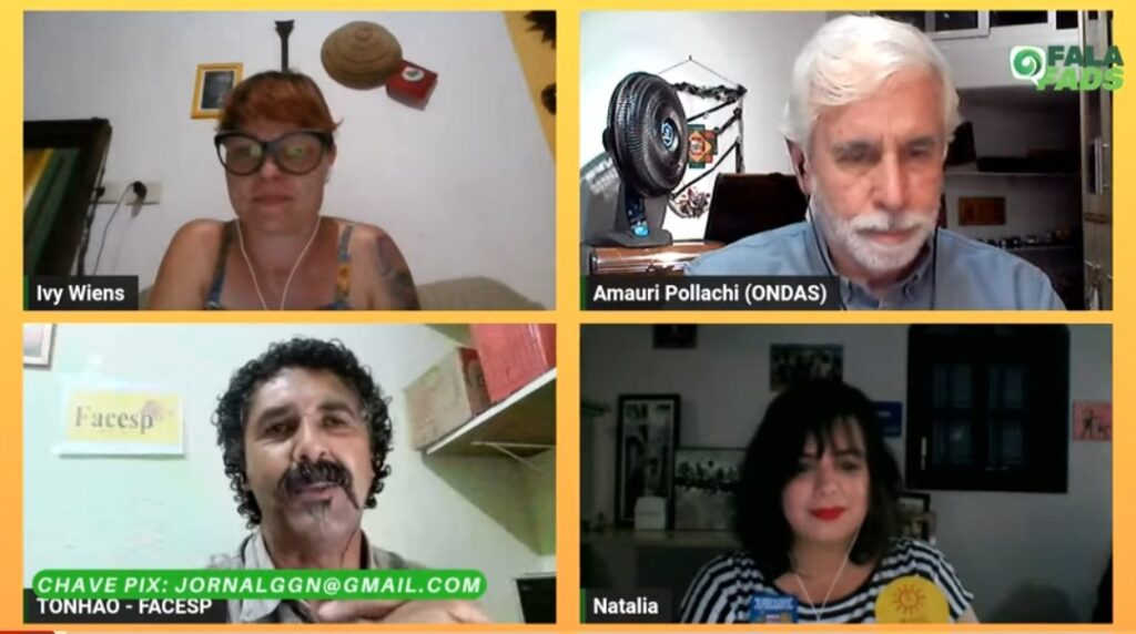 Na ocasião, Francisca Adalgisa, que é militante do Fórum Popular da Natureza e membro da comissão executiva do Observatório Nacional dos Direitos à Água e ao Saneamento (ONDAS), atuou na qualidade de âncora na discussão. Integram o debate, além de Amauri, que é também conselheiro do ONDAS; Antonio Pedro (Tonhão), participante do Movimento Comunitário, nas entidades FACESP e CONAM e no Movimento de Moradia (MDM); e Natália Felicissimo, coordenadora do Comitê Popular em Defesa da Sabesp.