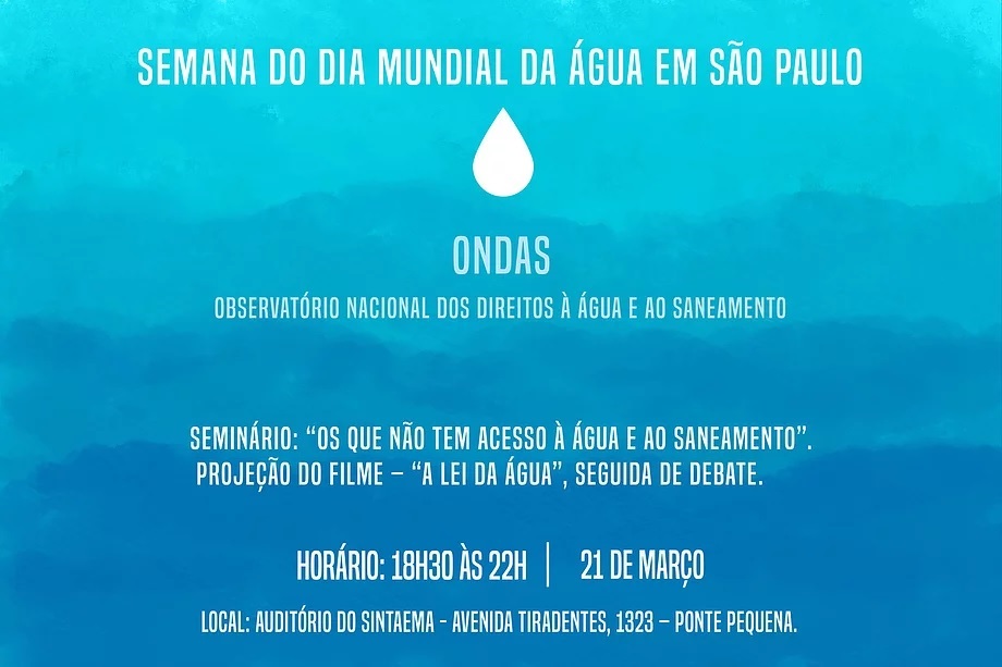 Horário: 18h30 às 22h – Realização conjunta: Sindicato dos Trabalhadores em Água, Esgoto e Meio Ambiente do Estado de São Paulo (Sintaema), Observatório Nacional dos Direitos à Água e ao Saneamento (ONDAS), Frente Nacional pelo Saneamento Ambiental (FNSA), Sindicato dos Trabalhadores em Água e Esgoto de Campinas (Sindae), Associação dos Profissionais Universitários da Sabesp (APU), Sindicato dos Urbanitários de Santos (Sintius). Palestrante: Renato Tagnin, Arquiteto e Urbanista, Professor Universitário e militante da área de meio ambiente